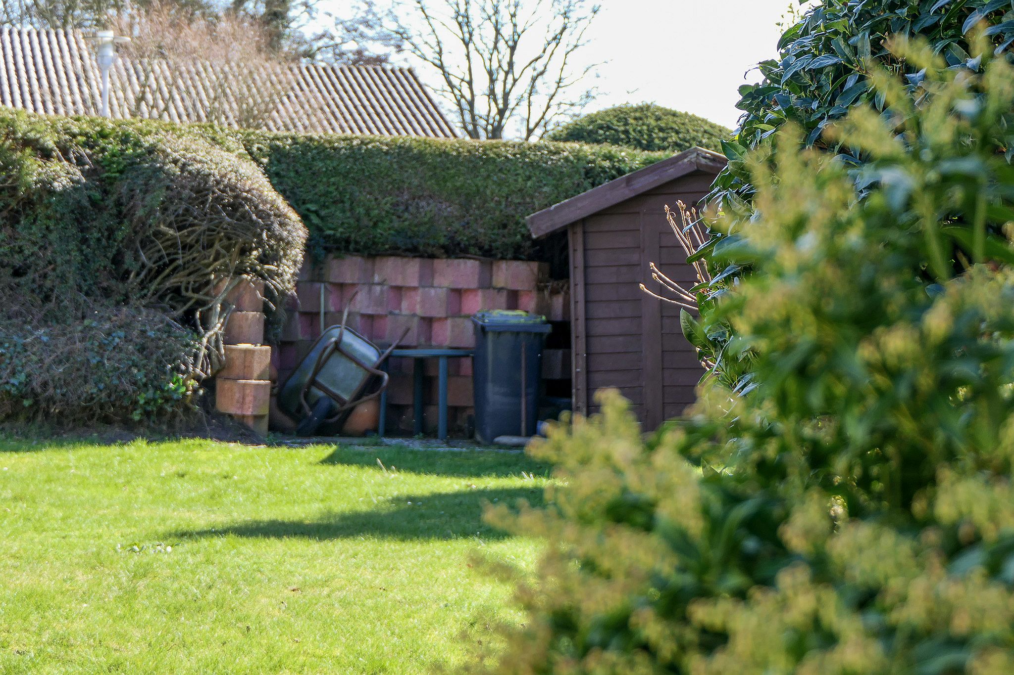 Zur Immobilie gehören außerdem eine große Garage, ein überdachter Abstellraum für Fahräder sowie ein separater Heizraum.